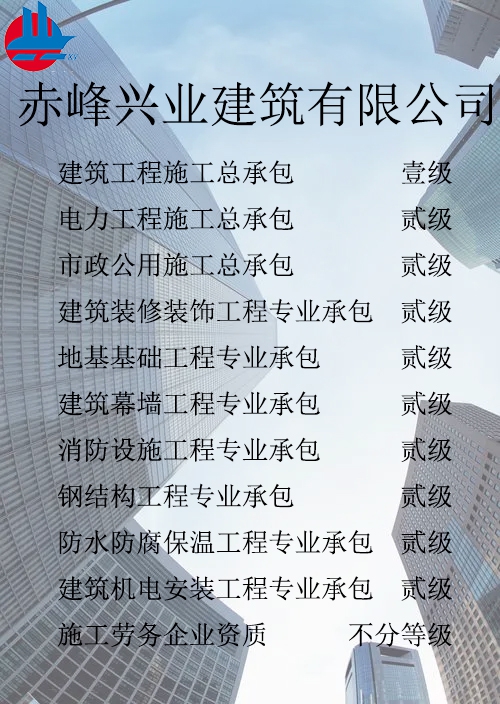 赤峰興業(yè)建筑有限公司簡介 赤峰興業(yè)建筑有限公司成立于1998年7月,位于內(nèi)蒙古赤峰市松山區(qū)。現(xiàn)已發(fā)展成為擁有建筑工程施工總承包壹級(jí)、電力工程施工總承包貳級(jí)、市政公用工程施工總承包貳級(jí)、承裝、修、試四級(jí)、?建筑裝修裝飾工程專業(yè)承包貳級(jí)、建筑幕墻工程專業(yè)承包貳級(jí)、消防設(shè)施工程專業(yè)承包貳級(jí)、地基基礎(chǔ)工程專業(yè)承包貳級(jí)、鋼結(jié)構(gòu)工程專業(yè)承包貳級(jí)、建筑機(jī)電工程專業(yè)承包二級(jí)、防水防腐保溫工程專業(yè)承包貳級(jí)以及建筑施工勞務(wù)等資質(zhì)的綜合性建筑施工企...